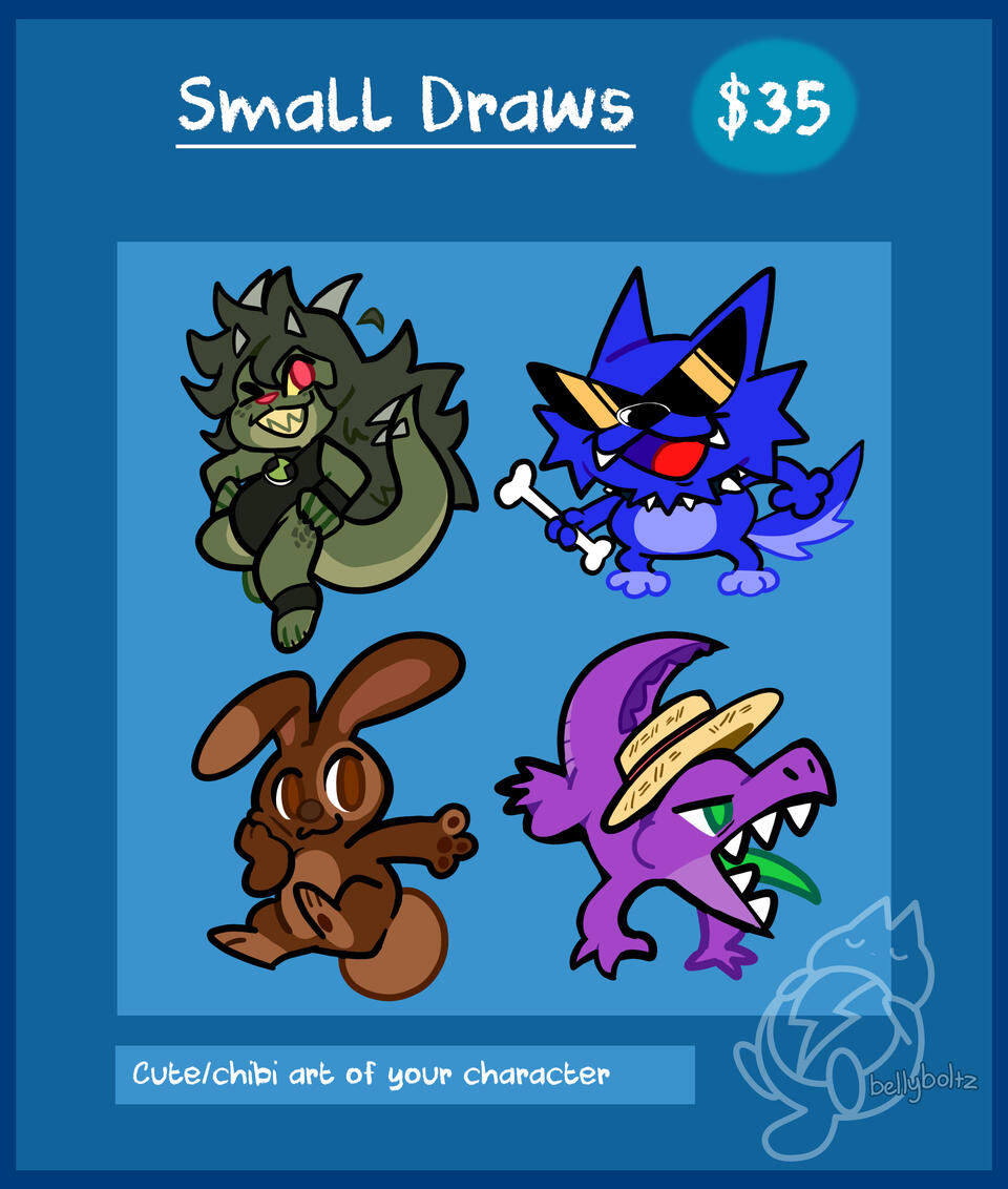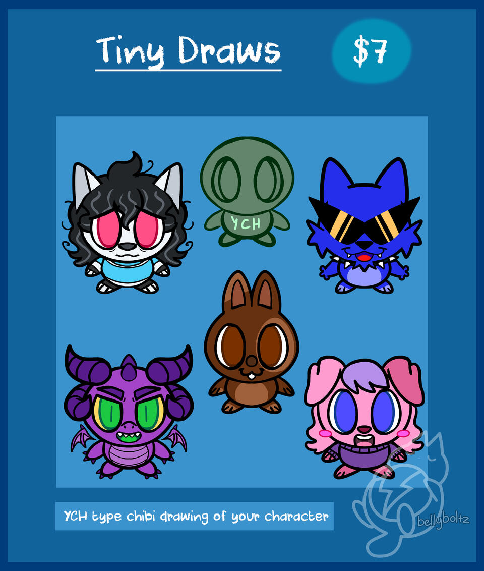 regarding the tiny draws: This is like a skeb/ surprise me type of deal since it is just a simple YCH (your character here), there will be no sketch provided. Once the product is provided edits are allowed